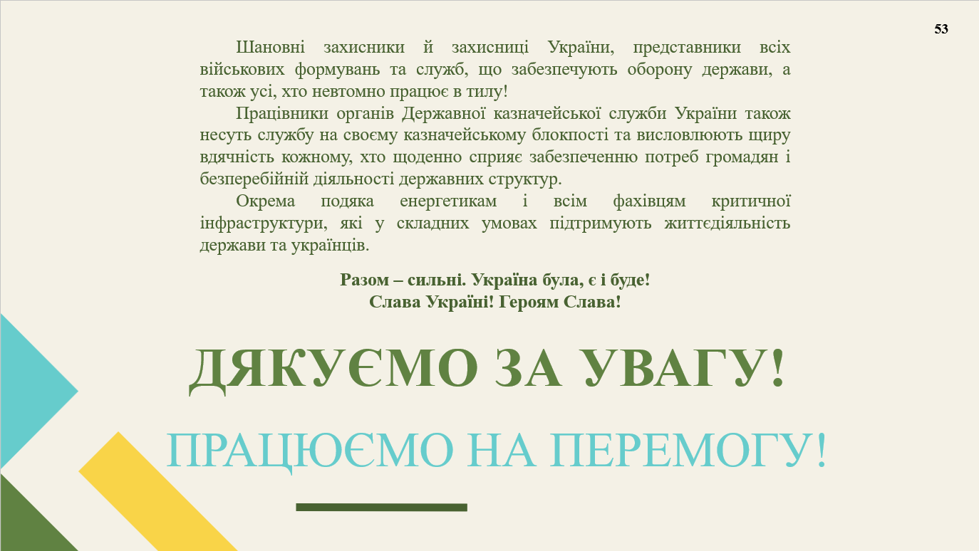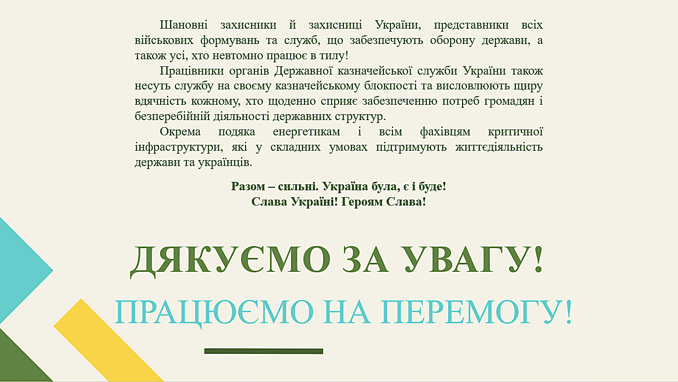 Окрему увагу приділено функціонуванню казначейської системи в умовах повномасштабної війни, забезпеченню безперервності платежів та належному виконанню завдань, покладених на органи Казначейства.